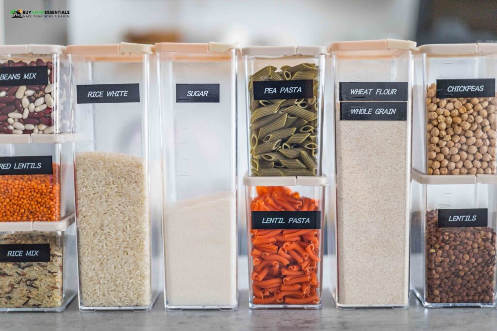 Kitchen storage organization using airtight containers.